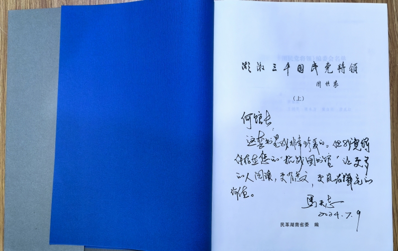 为赓续红色血脉,弘扬民族精神,充分利用抗日战争图书馆的现有资料,进一步激发企业家们的爱国主义热情,让更多的人了解抗日战争这段历史,2024年7月18日下午,长沙市企事业文联秘书长马天志再次到抗日战争图书馆走访交流,讨论长沙市企事业文联和长沙市抗战文化研究会、抗日战争纪念网以及抗日战争图书馆的交流合作,并向抗日战争图书馆赠送湖湘三千国民党将领》(上下册)一套。