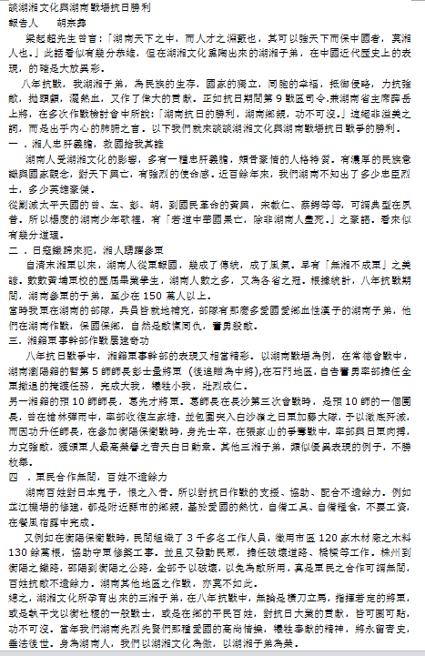 台湾中华湖湘文化发展协会监事、台湾黄埔军校32期胡宗彝发言稿
