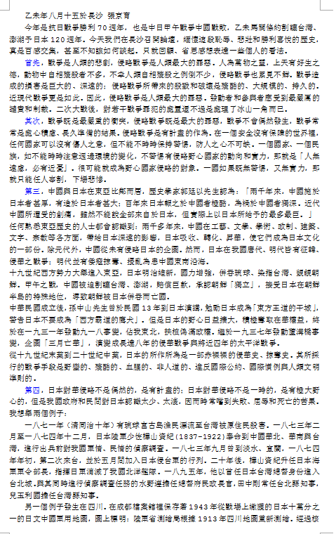 台湾中华湖湘文化发展协会理事长、“行政院大陆委员会主任委员”、 前台湾政治大学校长、前台湾新闻局局长张京育发表讲话。他说,战争是人类的悲剧,是最严重的冲突,而侵略战争则是人类最大的罪恶。战争不会偶然发生,战争常常是处心积虑、长久准备的结果。他提到,日本对华侵略不是偶然的,是有计划的,不是一时的,是有极大野心的,并就日本对华侵略的野心举了两个列子。还充分肯定了湖南人及湘军在抗日战争中作出的牺牲和贡献。