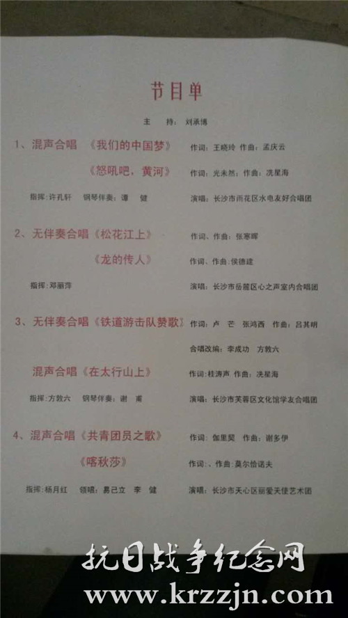 音乐会在长沙市雨花区水电友好合唱团的《怒吼吧,黄河》中拉开帷幕,气势恢宏的演奏,把大家带回烽火连天的抗日战争岁月,展现了抗日战争的悲壮图景。《松花江上》、《在太行山上》、《到敌人后方去》等经典抗战歌曲联唱,尽情讴歌了抗日军民同仇敌忾、奋起抵抗的壮志豪情。音乐会伴随着《在这片大地上》圆满落幕。