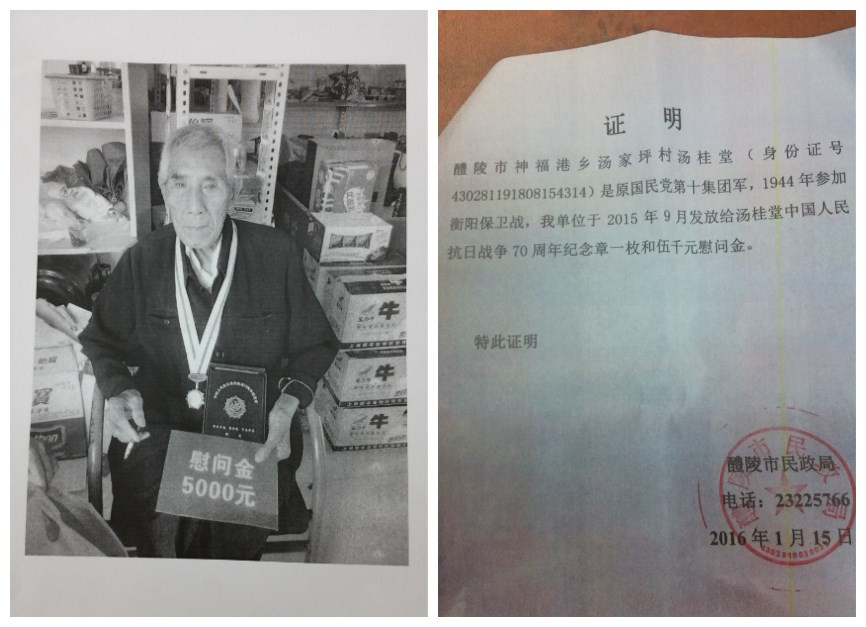 1月27日,湖南老兵之家执委郑鹏、长沙黄埔后裔联谊会岳麓分会会长王辉雄、湖湘文化研究会龚勇刚、抗日战争纪念网行政总监屈新平、宣传总监唐智轩,一行株洲醴陵。首先在醴陵统战部常务副部长付益田、醴陵统战部台办副主任丁桂华、醴陵统战部办公室林仕剑的热情接待下,就关爱抗战老兵进行了经验交流。随后,在长沙县统战部陈家志的陪同下,看望慰问了抗战老兵汤桂堂。