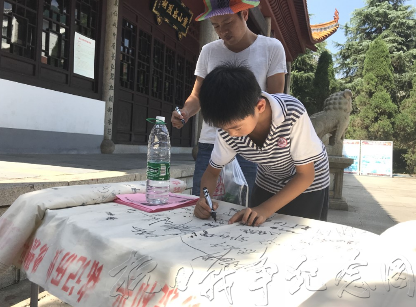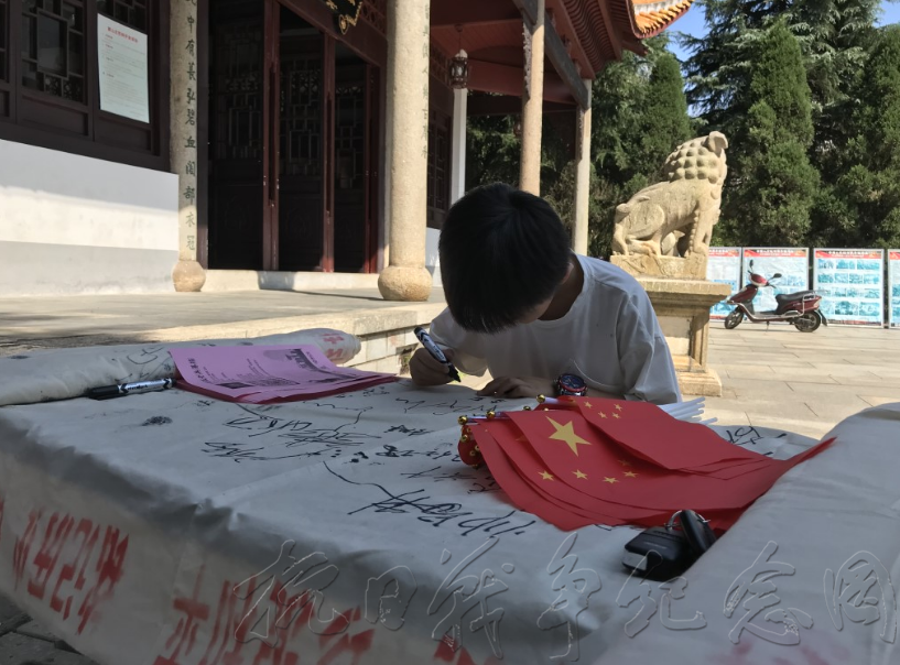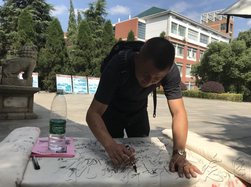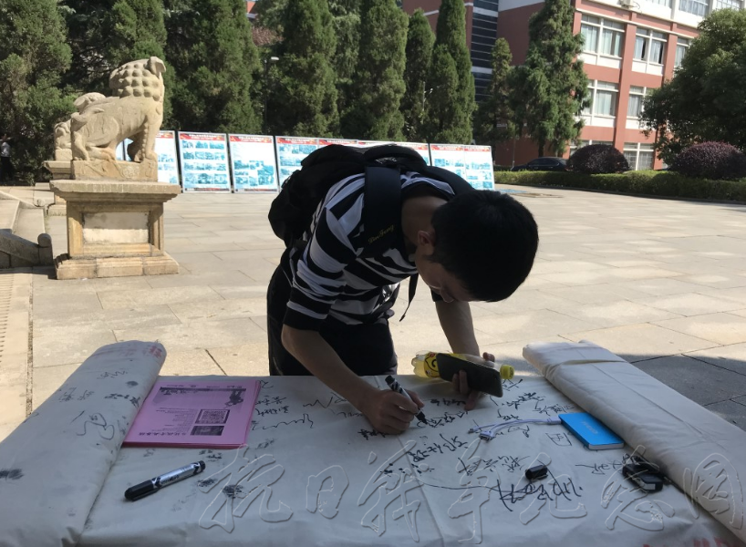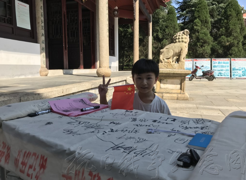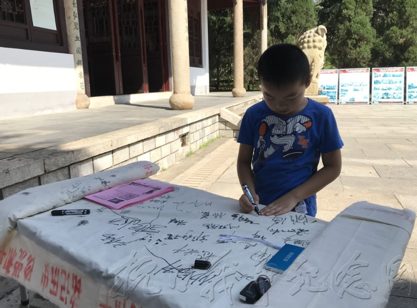 日本政府未就侵华战争公开、正式地道歉,为敦促日本政府公开、正式道歉,游客们纷纷拿起笔在签名布上留下自己的名字。