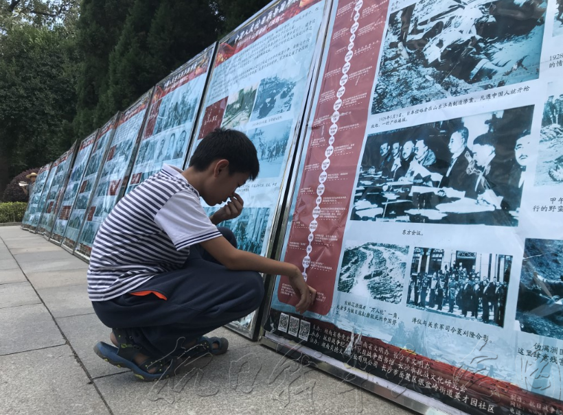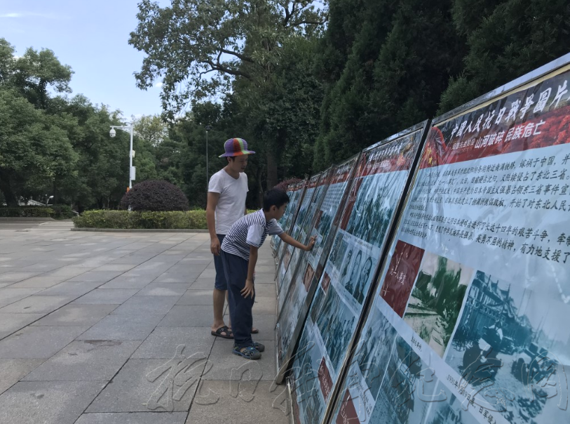 上午,一对父子来此游玩,孩子在展板前看得很认真,家长说下午还会带着孩子和孩子的妈妈来。一对夫妇带着女儿从外地来岳麓山游玩,他们告诉记者:“我们从外省来到岳麓山,参观了抗日战争纪念园,观看了这里的展览,感觉很有意义,尤其是对孩子。”