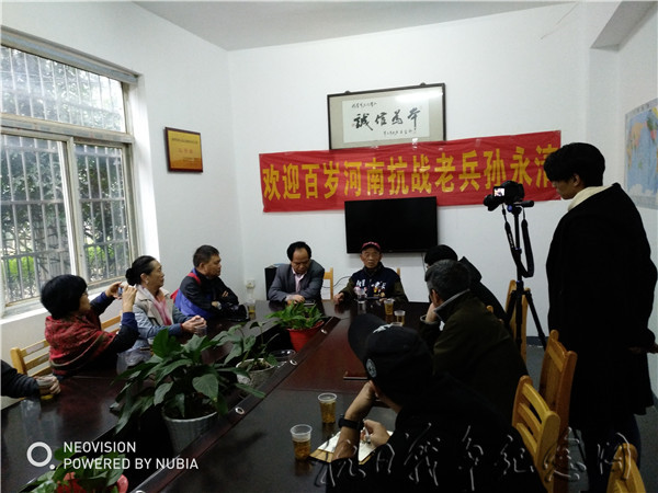 2017年11月17日,在原国民革命军第102师师长柏辉章将军孙女柏梅女士、抗战研究专家康振贤先生、原国民革命军第102师306团3营营长刘正材后人刘晓美女士、原国民革命军第102师304团3营营长顾维汉后人顾泽仁先生、河南关爱抗战老兵志愿者三乐、雨露、苹果王、金环(彩虹糖)陪同下,河南籍百岁抗战老兵孙永清参观抗日战争纪念网、抗日战争图书馆,并与当地抗战研究专家、关爱抗战老兵公益组织代表座谈。