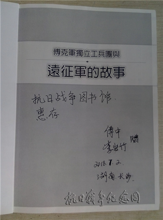2018年7月2日,深圳市龙越慈善基金会国际合作交流部经理、滇西抗战纪念馆顾问李岩竹代表傅中先生向抗日战争图书馆赠送《傅克军独立工兵团与远征军的故事》。