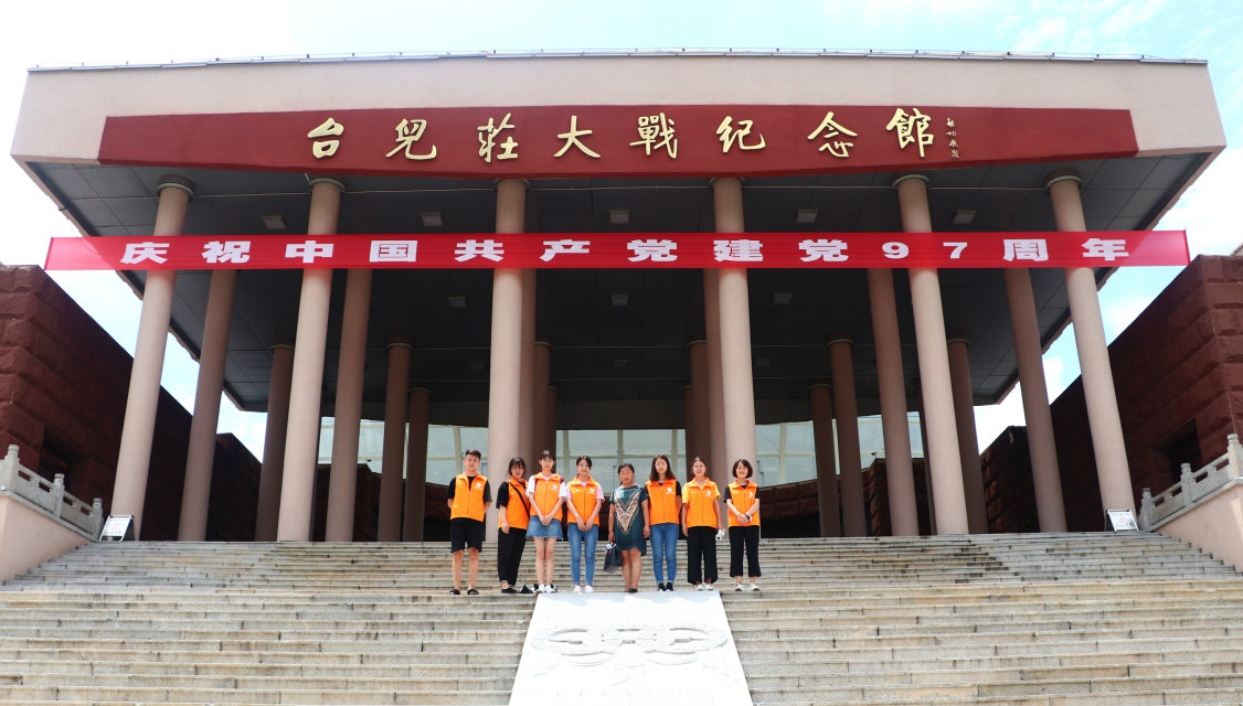 山东大学(威海)暖兵筑梦志愿服务团支队人员在台儿庄大战纪念馆前合影