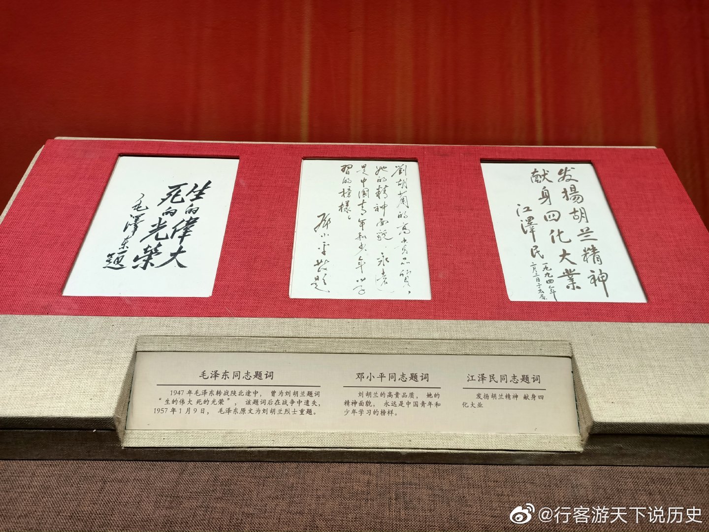毛泽东题词“生的伟大,死的光荣”,邓小平题词“刘胡兰的高贵品质,她的精神面貌,永远是中国青年和少年学习的榜样”,江泽民题词“发扬胡兰精神,献身四化大业”,对刘胡兰短暂而伟大的一生予以高度评价。