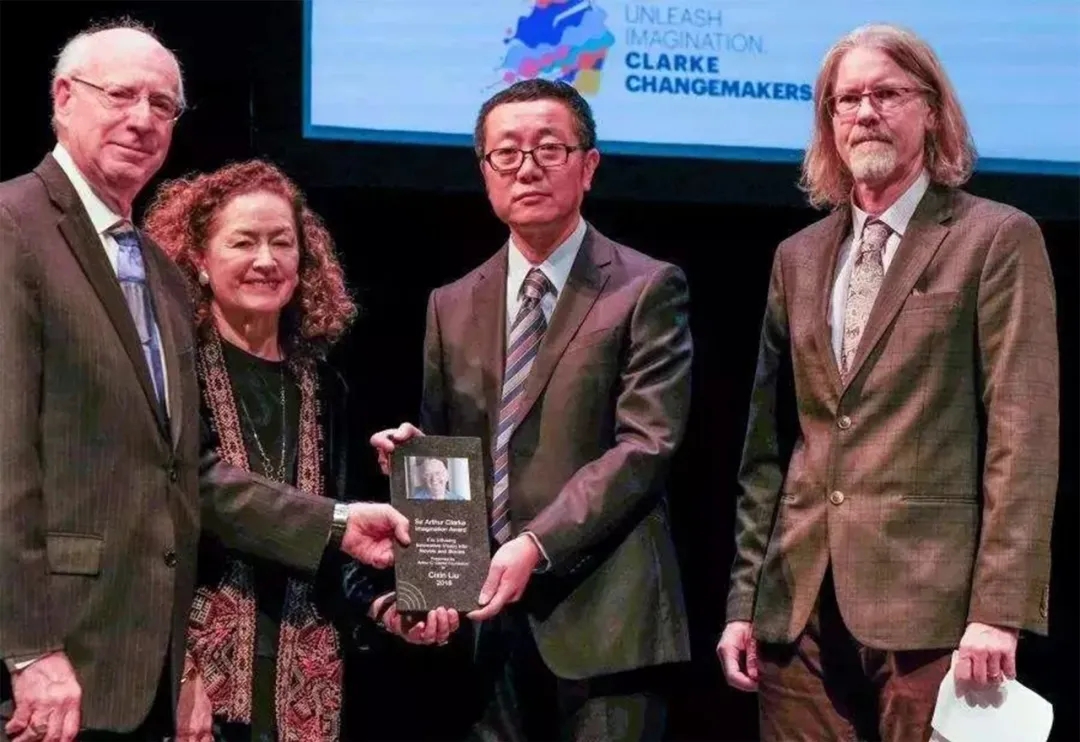 2018年11月8日,刘慈欣(右二)在美国获克拉克想象力服务社会奖。