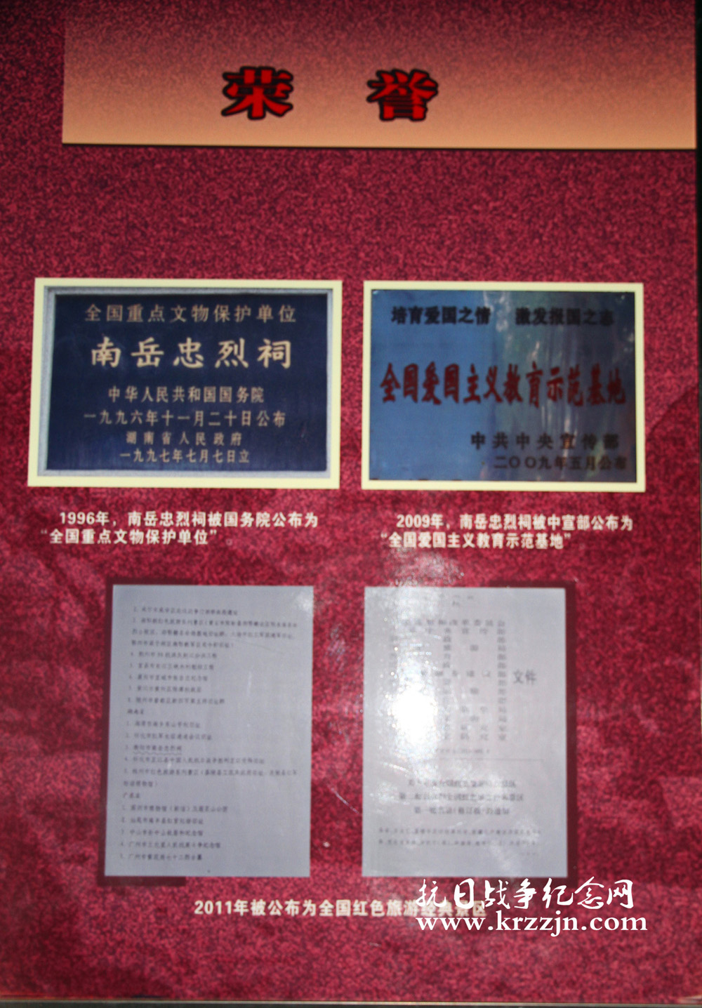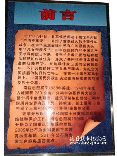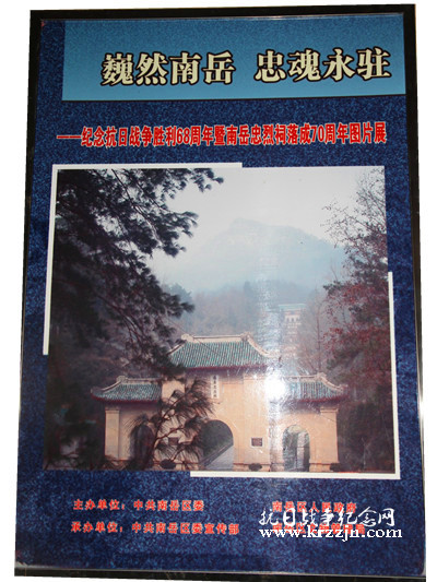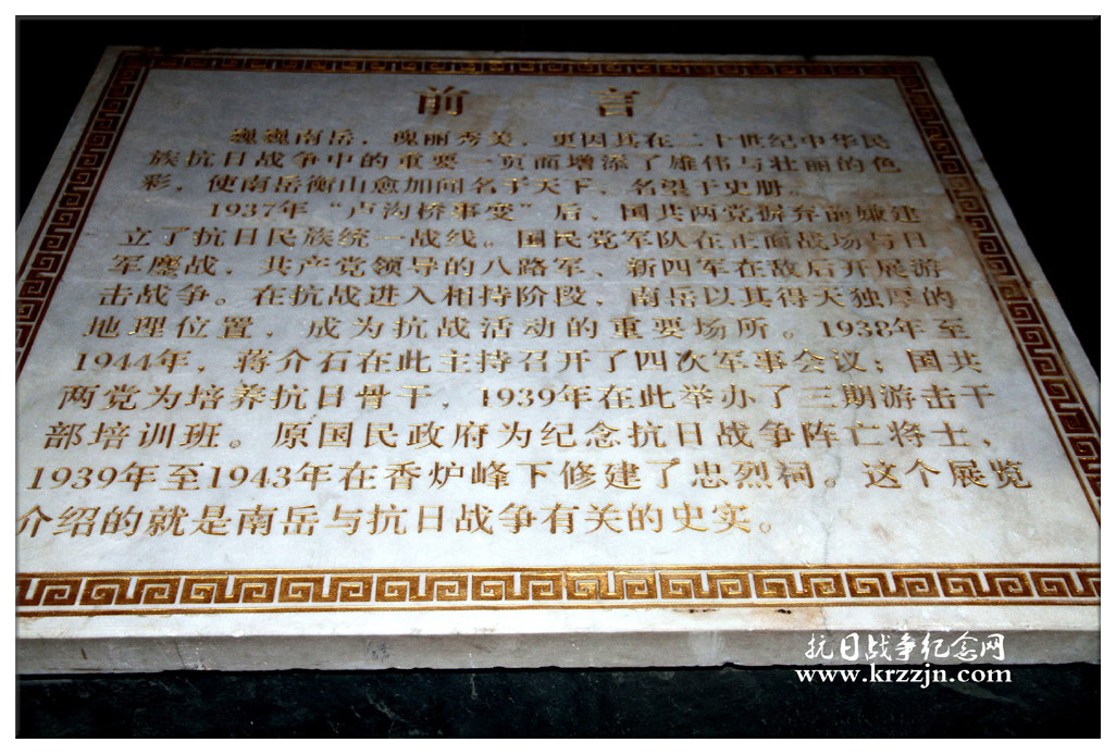 1937年“芦沟桥事变”后,国共两党摒弃前嫌建立了抗日民族统一战线。国民党军队在正面战场与日军鏖战,共产党领导的八路军、新四军在敌后开展游击战争。在抗战进入相持阶段,南岳以其得天独后的地理位置和环境,成为抗战大本营活动的重要场所。1938年至1944年,将介石曾在这里召开四次军事会议;国共两党为培养抗日骨干,1939年在此开了为期三期游击干部训练班;国民政府为纪念战死疆场的将士,1939年至1943年在香炉峰下修建了忠烈祠,这个展览介绍的就是南岳与抗日战争有关的史实。
