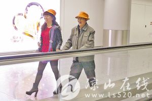 西昌98岁的抗战老兵徐开祥和女儿在候机厅内大步前进。