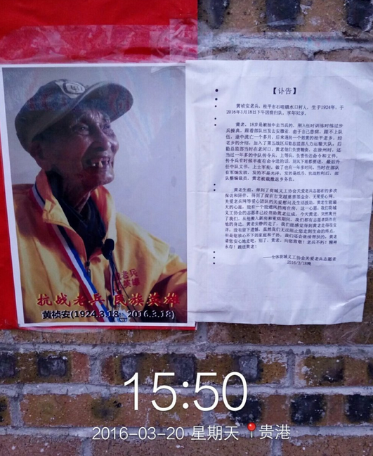 黄祯安老兵,桂平市石咀镇水口村人,生于1924年,于2016年3月18日下午因病归队,享年92岁。黄老生前,得到了荷城义工协会关爱老兵志愿者的多次探访和陪伴,得到了深圳市龙越慈善基金会、无冕爱心网、关爱老兵网等爱心团队的关爱慰问及生活援助,黄老生前最大的心愿,能有一个能遮风挡雨住房,这一心愿,我们荷城义工协会的志愿者已经帮助黄老达成,从他搬入新房和重病期间,都有志愿者陪伴在他的身边,黄老走得很安详,没有留下遗憾,虽然我们无法阻止您走得生命的终点,但是您放心不下的家庭和子孙,我们还会继续帮扶的,黄老请您安心地走吧,别了,黄老。向您致敬!老兵不朽!精神永存!跪送黄老!
