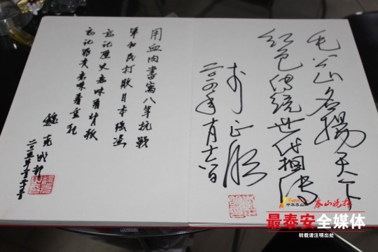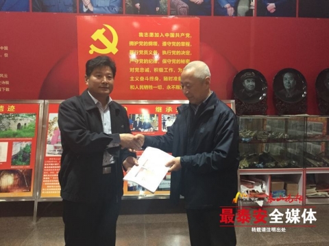 4月6日一大早,泰安毛公山红色文化博物馆迎来了一名特殊的客人,他是抗战老兵魏克的儿子魏国,这次特意赶到肥城市,将96岁的老父亲魏克托付的《抗战大阅兵记实》、《坚持泰西八年全面抗战》、纪念中国人民抗日战争暨世界反法西斯战争胜利70周年大阅兵邮票一张等文献资料捐赠给毛公山红色文化博物馆。