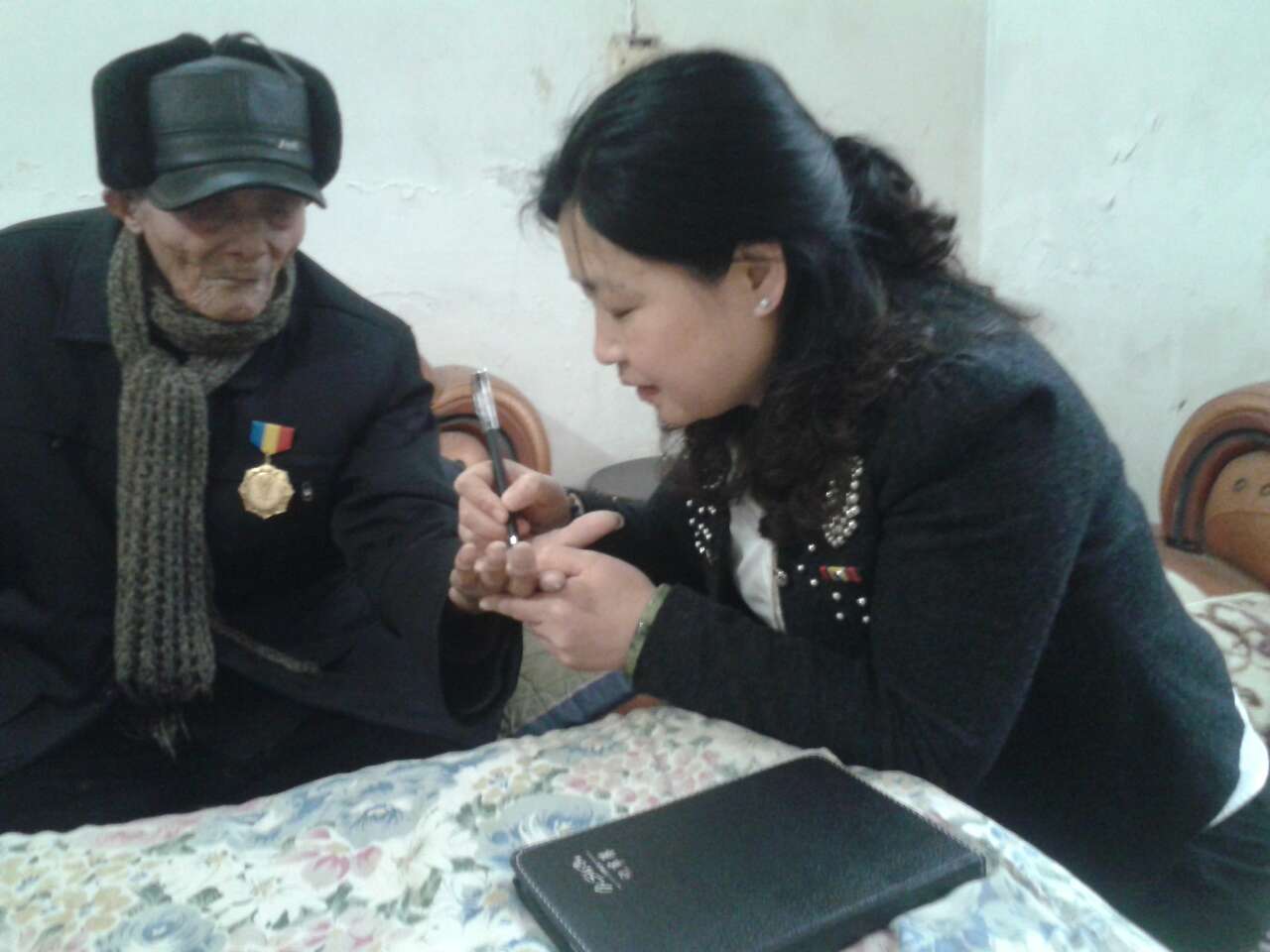 这次去湛老家,刚办完百岁寿诞的湛家热闹非凡,湛老听到我们志愿者到来,很快就从楼上他的“工作室”下来了,我本想上去搀扶一下他,被他拒绝了,他儿子解释说他从来不需要别人搀扶,湛老下楼的速度不像是个百岁的老人,湛老耳背但眼睛还好看字可以不戴眼镜,我们和他聊天,用纸和笔来比划。
