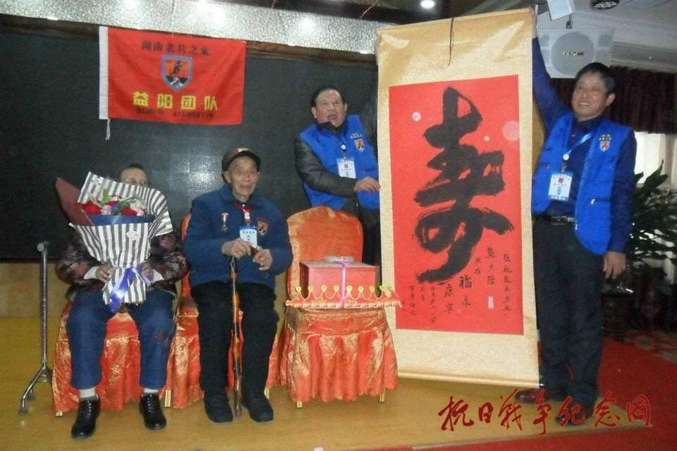 抗战老兵生日(益阳20) 2016.11.27 今天在这冬日暖阳美好的日子, 湖南老兵之家益阳团队: 柔情、迎春、糕、茉莉花、文倩、便便妈妈、漂泊、回眸、白沙、天空 一行10人带着全体志愿者的深情祝福,来到资阳区驿园宾馆酒楼为抗战老兵龚先阶爷爷97岁大寿庆贺 ! 望着儿孙满堂,家庭和谐、儿女孝顺的后代,看到俩老脸上洋溢着的幸福笑脸,志愿者们感到由衷的高兴。志愿者向龚爷爷敬献了鲜花和蛋糕、生日礼金;为他点燃生日蜡烛,围着老人唱起生日快乐歌。最后志愿者与亲友们,一同举杯共祝龚爷爷生日快乐,福寿安康 ! 感谢湖南老兵之家和益阳团队为龚爷爷赠送生日寿金、蛋糕和鲜花 ! 感谢长沙抗战后代易先生为龚先阶爷爷赠送寿堂一付 ! 感谢一线志愿者的积极参与 ! 老兵有我们, 老兵明天会更好!