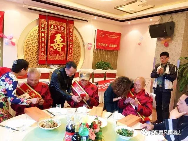 成都蜀风园大酒店在王虹女士的带领下从2012年开始一直致力于关爱抗战老兵的公益活动。2012年开始照顾抗战老兵苗存惠爷爷,每年4月苗爷爷的生日,王虹都会为苗爷爷办一个热热闹闹的生日会。苗爷爷也因此和蜀风园结下了深厚的情谊。今年4月是苗爷爷的百岁寿诞,三位分别年满100岁、99岁、98岁的抗战老兵爷爷,在王虹女士和志愿者们的关爱下,度过了一个幸福美满的生日会。