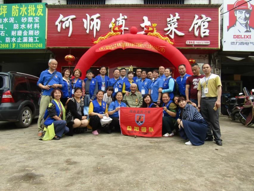 #2017.05.15#今天上午湖南老兵之家益阳团队和桃江众心志愿者及沧水铺地区志愿者共50多人在沧水铺镇敬老院餐厅 , 为桃江籍抗日孤老老兵詹子开爷爷93岁生日举行祝寿活动 ! 詹爷爷今天特别高兴 , 因为在詹爷爷的人生中从来没有人为他做过这么热闹的生日 , 詹爷爷一直笑过不停 , 频频向志愿者敬礼致谢 ! 志愿者们也感到由衷的高兴。志愿者向詹爷爷敬献了鲜花和蛋糕、生日礼金、寿堂、仿军服、逍摇椅... ; 为他点燃生日蜡烛切开蛋糕,围着老人唱起生日快乐歌。仪式后我们陪着詹爷爷到镇上酒家聚餐 , 举杯共祝詹爷爷生日快乐 , 福寿安康 ! 感谢湖南老兵之家和益阳团队为詹爷爷赠送蛋糕和鲜花及逍摇椅 ! 感谢长沙抗战后代易先生为詹爷爷赠送寿堂一付 ! 感谢广州雯斐服饰有限公司董事长邓建华先生赠送仿原国民革命军服一套 ! 江苏省民建,南京市民建、爱德基金会、南京民间抗日战争博物馆向詹爷爷敬献生日寿金1000元 ! 感谢桃江众心志愿者协会赠送生日礼金600元和礼品 ! 感谢志愿者太阳雨送生日礼金100元 ! 感谢杨振平及同伴送的礼品 ! 感谢志愿者及爱心人士的积极参与,感谢忘龄乐、何光辉、赤磊红道、革命闯将、 杨振平、莫义华出爱心车平安往返 !