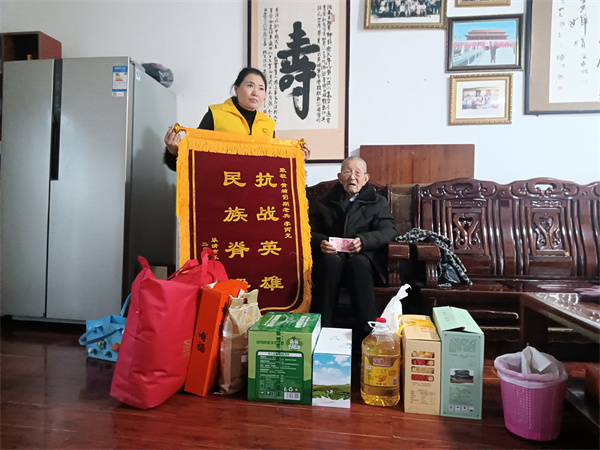 12月10日,杨素敏驾电动三轮车带着北京铁血老兵暖冬慰问物资与储敏一起到颍西镇某小区拜望103岁黄埔18期抗战老兵李丙光,送上社会各界的祝福和温暖。同时,浙江省乐清市乐公益的陈老师特意送上致敬红包1000元和锦旗一面(上印:致敬黄埔18期老兵李丙光/抗战英雄/民族脊梁)。