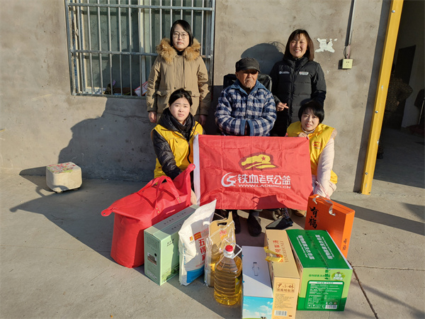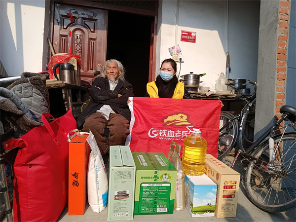 12月17日,吕梅梅带队,李志强驾车行驶近百里,与志愿者王艳、崔路婷、王盼难到颍东区枣庄镇拜望志愿军老兵李彩珍,送上北京铁血老兵公益的棉被、米、面、油、洗衣液、土特产粉丝、银耳梨粥等暖冬生活物资。