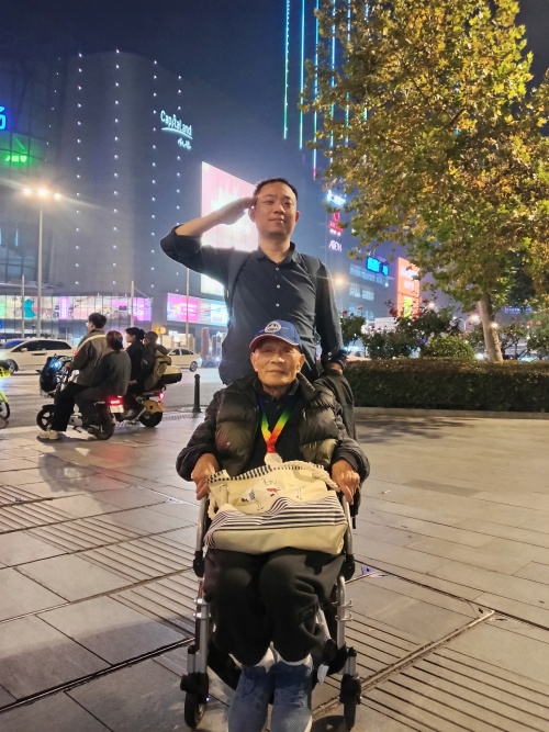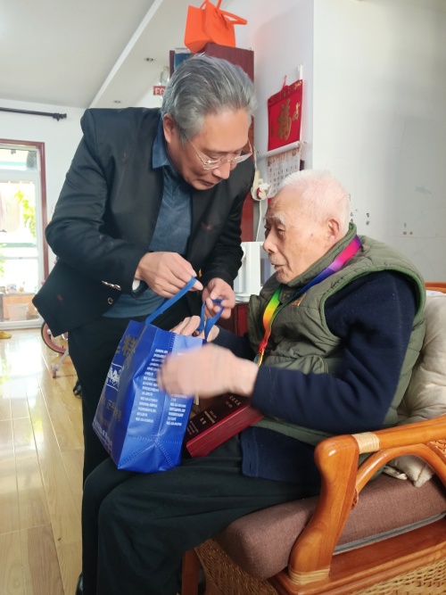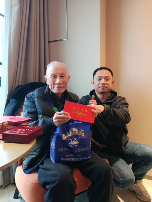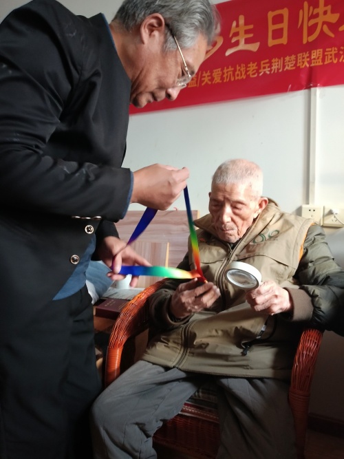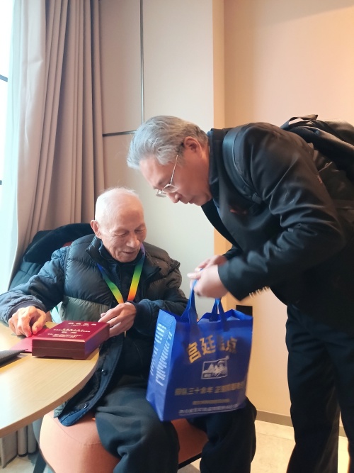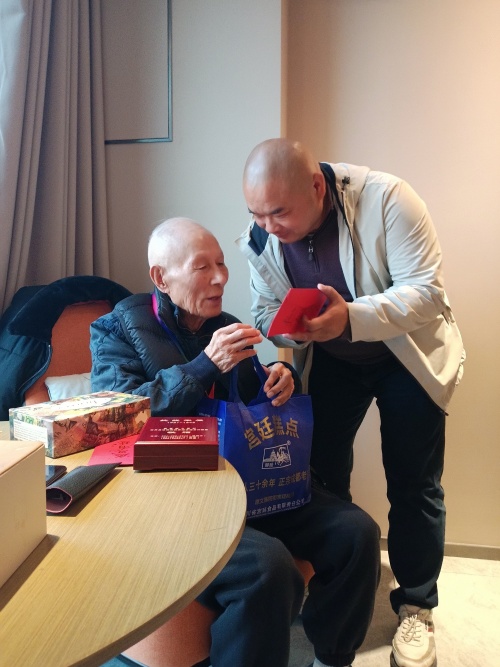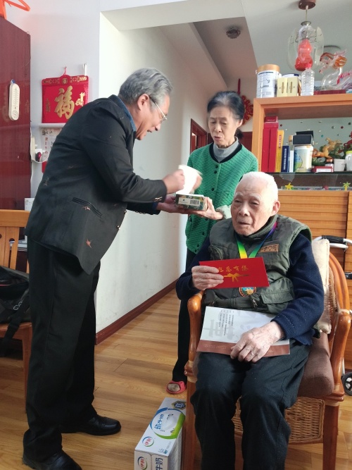 2025年11月14日下午至晚间,黄埔抗战老兵后代傅昨非带队,偕同黄埔抗战老兵后代曾德苗、武汉及四川眉山关爱抗战老兵志愿者吴峰、钟伟,专程前往抗战老兵李松卓、邹崇芬的家中,以及彭国军老人居住的酒店,慰问三位百岁抗战老兵。慰问组为三位老兵郑重佩戴由世界华人周刊定制的抗战胜利八十周年纪念章,并转送爱心款项:其中向李松卓、邹崇芬两位老人转交国内爱心人士捐赠的爱心款,向彭国军老人转交旅居海外黄埔后裔专门捐赠的爱心款。期间,三位老兵还分享了四川眉山志愿者钟伟带来的当地特产,现场氛围温馨感人。