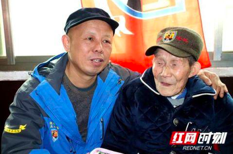 李志明和武冈百岁抗战老兵龚亲龙在一起。