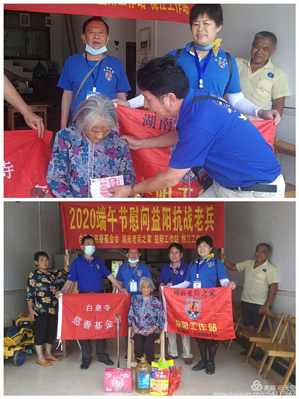 2020年6月17、18日,安化东坪梅城组志愿者虫二、曹放轩、文倩、茉莉花、盼盼、天空、梅城李嗲、一片云、周老板一行9人,因天气炎热、路程远,分二天对五位抗战老兵爷爷李礼忠、刘又生、喻玉熙、罗后中、张应升的遗孀上门进行慰问,并送达白鹿寺慈善基金会的礼金200元,湖南老兵之家的安慕希酸奶、鸳鸯皮盐蛋、羊乳饼干各一盒。
