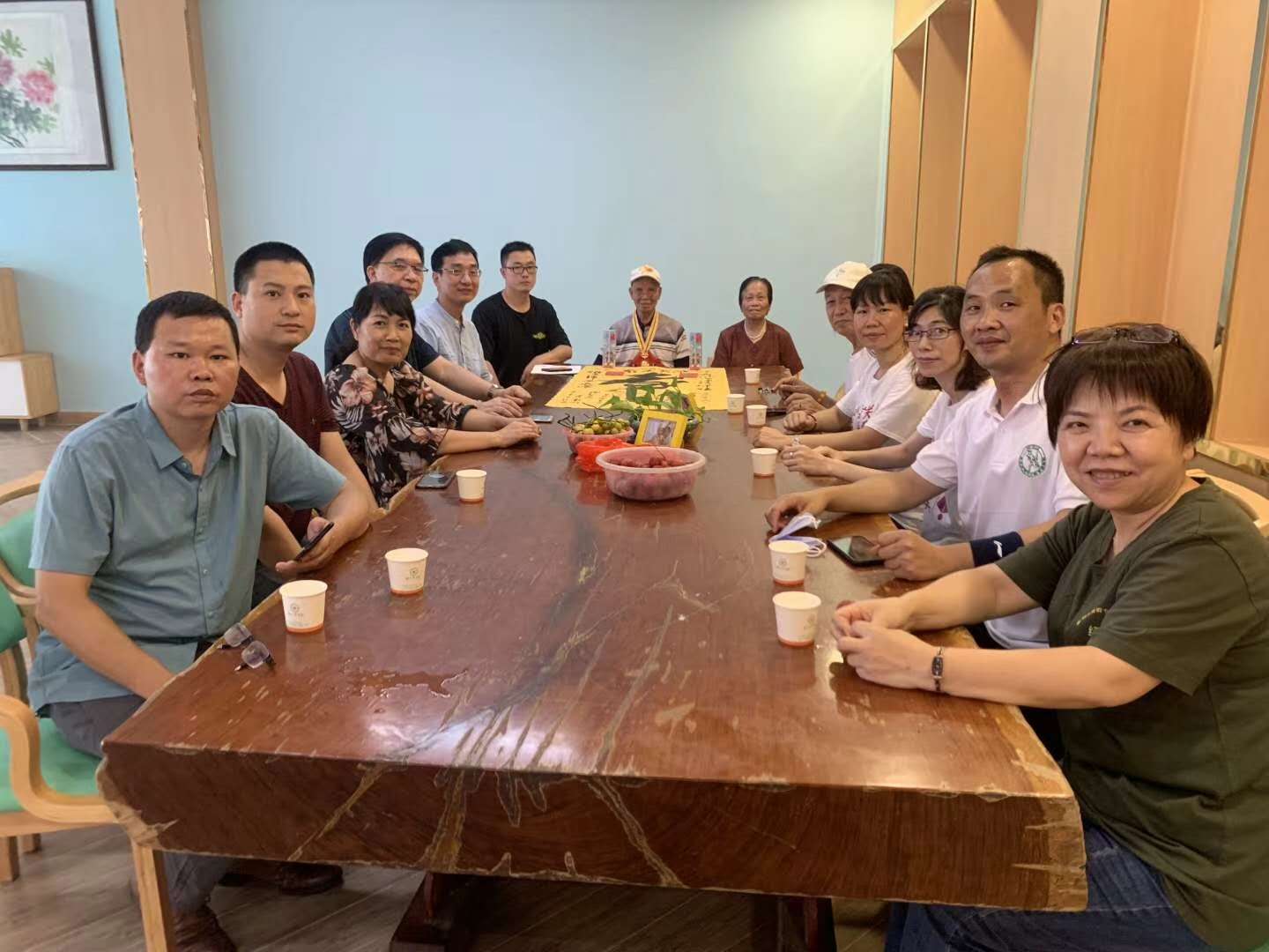 从张展猷老兵家出来直奔第二站,广州市颐养中心探望黎威权老兵。黎老有个习惯,只要王丰姐或者其他志愿者提前说好要来看他,黎老都会早早在楼下迎接,今天也不例外。车子刚进大门,就看见黎老一个人站在门口走廊,手里拧着一张向中心主管提出申请的纸条(疫情期间严格控制外来探望人数),翘首以盼,已等待多时。可我们一同前往的志愿者有14人,家里也坐不下,索性在一楼会客厅开启了“长桌会议”。