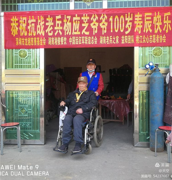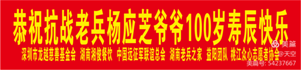 今天我们在这里欢聚一堂,庆贺杨应芝抗战老英雄100岁寿诞,在此我代表湖南老兵之家益阳团队的全体志愿者向杨爷爷致以崇高的敬意! 1931年9月18日,日本在中国东北发动侵华9.18事变后,日本帝国主义全面侵华战争开始。随后抗日的14年中,无数英勇的中华儿女,前赴后继,与穷凶极恶的日本鬼子进行了艰苦卓绝的战斗。无数中国人民的优秀儿女为了民族解放,为了国家独立,献出了宝贵的生命!我们深切地怀念这些国家的勇士!在我们的身边,还生活着一批参加过那场伟大卫国战争的老兵,他们是我们国家的英雄;他们是我们中华民族的好儿女;他们,是值得我们 晚辈们敬重的先辈!杨爷爷就是参加过那场伟大卫国战争的勇士!我们向他致以崇高的敬礼!