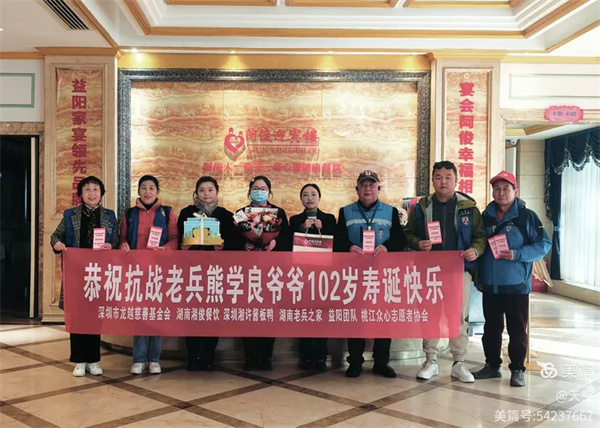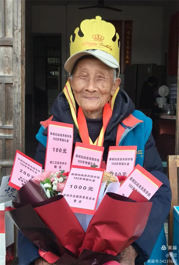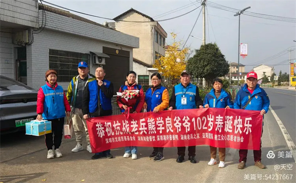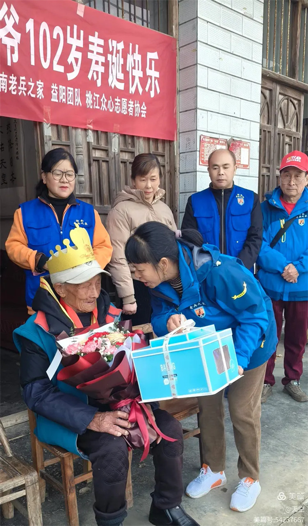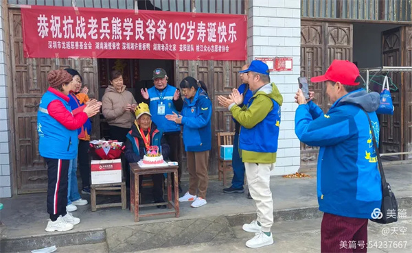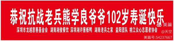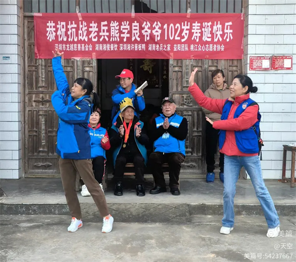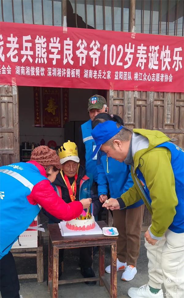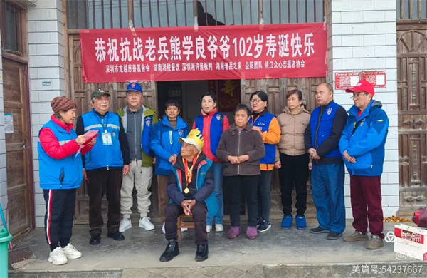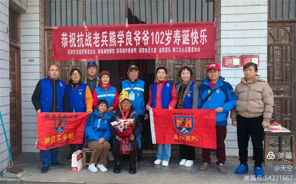 2025年12月3日上午,冬日暖阳,迎来了桃江县原国民革命军99军学生教导总队37电台抗战老兵熊学良爷爷102岁寿辰,湖南老兵之家益阳团队天空、文倩、虫二、一鸣惊人、知乐、钟乐、周小叶、文小贤、文惠娥一行9人。带着全体志愿者对抗战老英雄的深情祝福,前往桃江县大栗港镇德茂园村为熊爷爷贺寿。看到熊爷爷一早就坐在大门前等候志愿者的到来,我们的心情感到十分的高兴。在大门框上边挂好横幅后,举行了贺寿仪式,由理事钟乐主持。敬爱的熊爷爷,今天是您的生日。岁月匆匆,转眼间您已步入古稀之年。在这特殊的日子里,衷心祝愿您福如东海长流水,寿比南山不老松。愿您的生活充满阳光和欢笑,每一天都过得充实而又快乐。