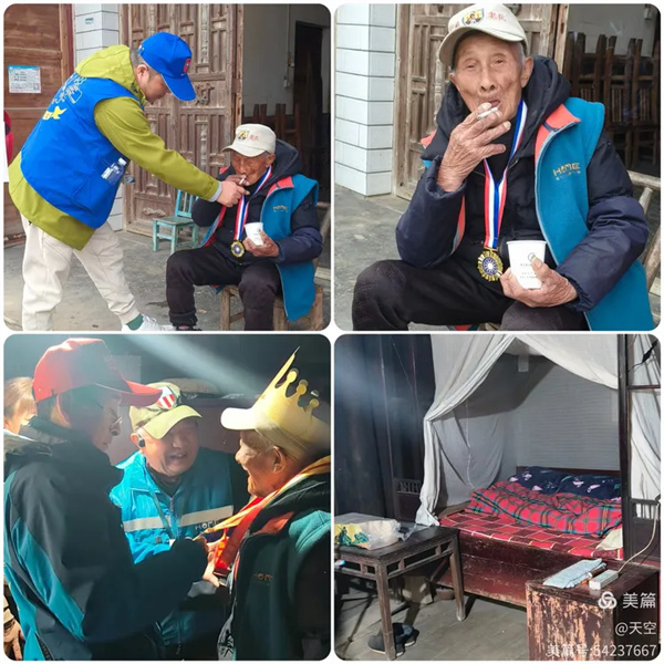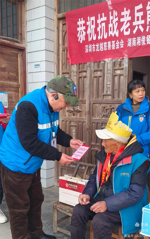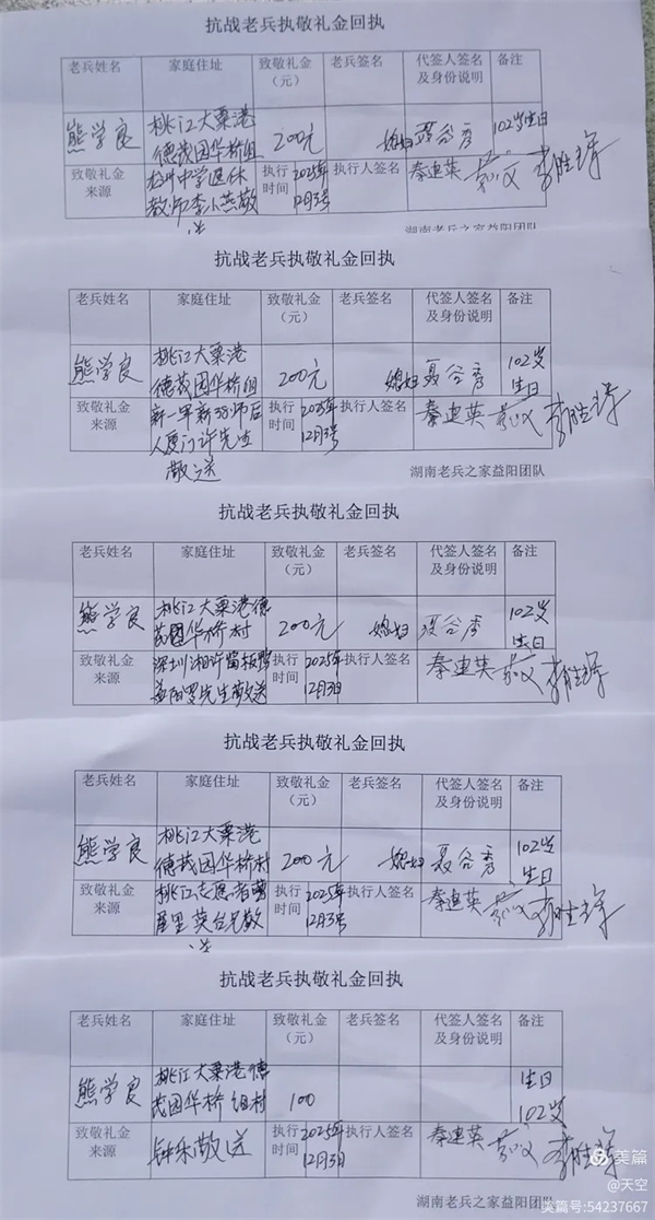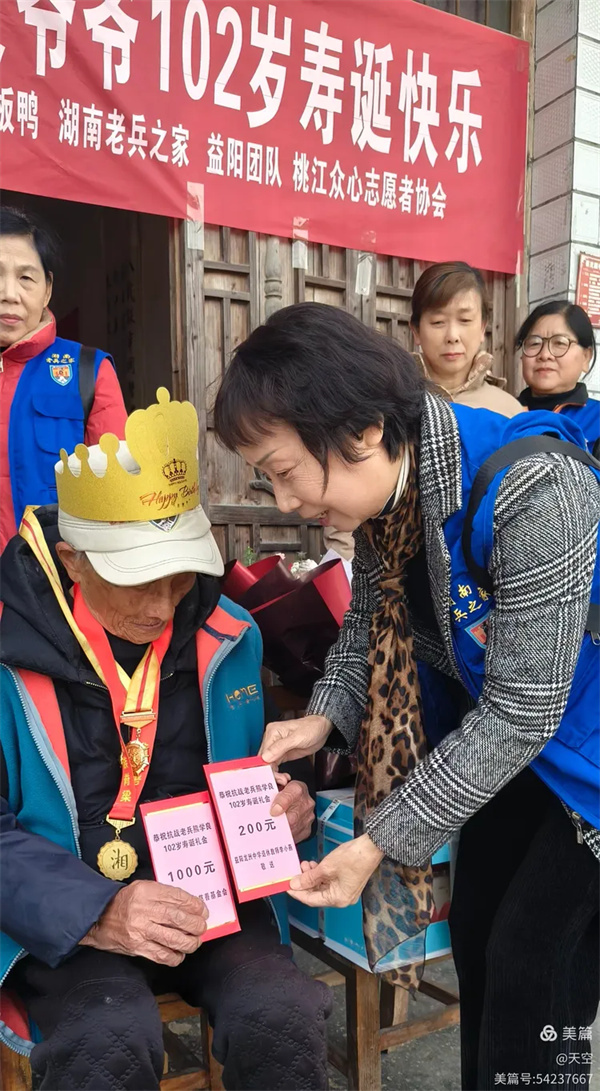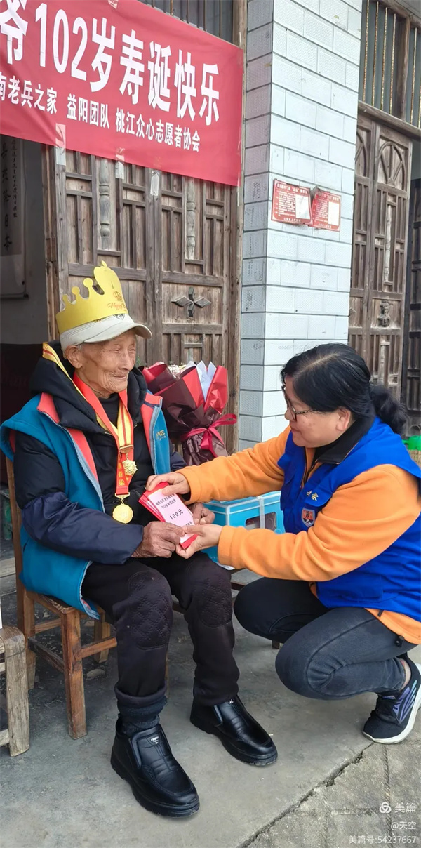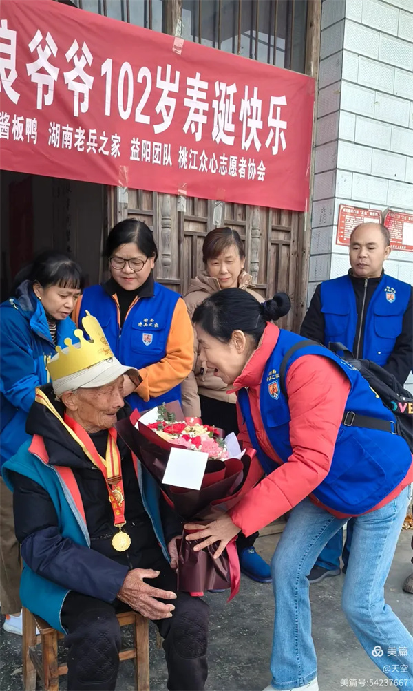 2025年12月3日上午,冬日暖阳,迎来了桃江县原国民革命军99军学生教导总队37电台抗战老兵熊学良爷爷102岁寿辰,湖南老兵之家益阳团队天空、文倩、虫二、一鸣惊人、知乐、钟乐、周小叶、文小贤、文惠娥一行9人。带着全体志愿者对抗战老英雄的深情祝福,前往桃江县大栗港镇德茂园村为熊爷爷贺寿。看到熊爷爷一早就坐在大门前等候志愿者的到来,我们的心情感到十分的高兴。在大门框上边挂好横幅后,举行了贺寿仪式,由理事钟乐主持。敬爱的熊爷爷,今天是您的生日。岁月匆匆,转眼间您已步入古稀之年。在这特殊的日子里,衷心祝愿您福如东海长流水,寿比南山不老松。愿您的生活充满阳光和欢笑,每一天都过得充实而又快乐。