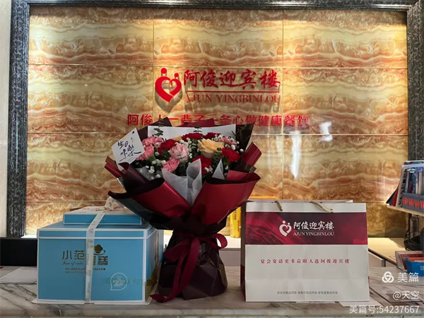 △阿俊迎宾楼敬送鲜花,有请志愿者知乐代送。