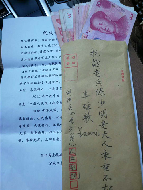 陈老“不畏强暴,抵御外辱”的精神和顽强战斗的抗日事迹深深地感动了志愿者,为了更好地纪念这位老人,留下老人曾经抗日的历史足迹,志愿者臣民与老兵家属商议为老人立碑的事宜,并捐献立碑款2000元,还为老人拟好碑文。