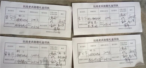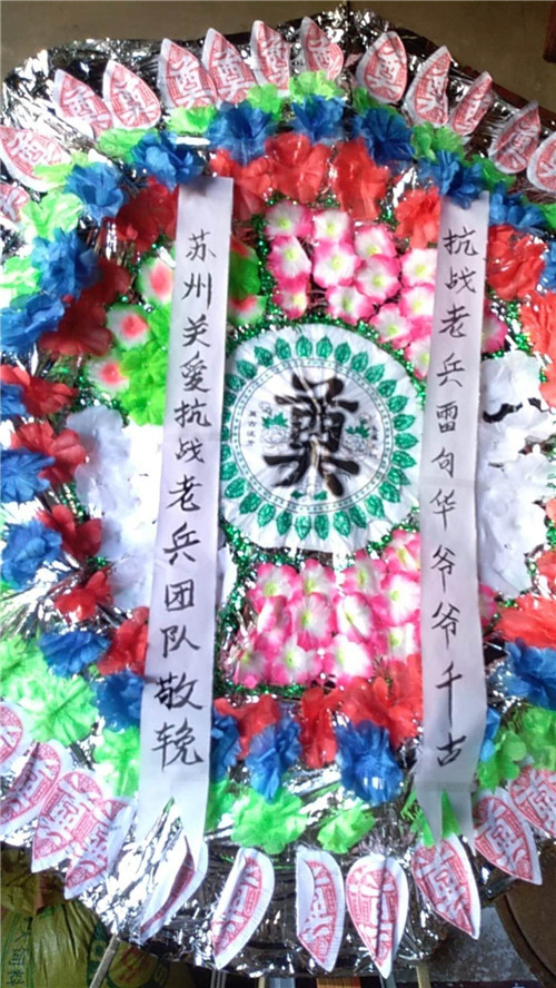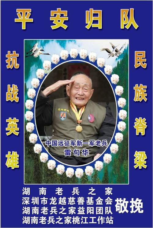 雷爷爷于7月24日16时31分在家安祥逝世,享年100岁。我们为雷爷爷举行了简朴的追悼会,由桃江工作站负责人文小贤致悼词:“1938年11月,雷爷爷在县城报名参加税警总团,跟随长官孙立人将军到贵洲都匀集训练兵三年,到缅甸参加了仁安羌战斗,穿越了野人山到达印度兰姆咖整训,通过反攻二次入缅全面胜利。 1945年到广州接受日本受降! 80年前的战火硝烟早已散尽,但历史的沉痛不能被淡忘,当年为驱除侵略者抛头颅、洒热血的抗战军人不能被淡忘。2015年雷爷爷收到中共中央、国务院、中央军委颁发的纪念抗战胜利七十周年纪念章和一次性补助5000元!今天我们在这里悼念雷爷爷,是想让更多的人了解雷老年轻时为国家和民族所做出的贡献,值得我们晚辈尊敬!他是抗日的英雄,是民族的骄傲,是我们心中的丰碑!老兵不死 ,只是慢慢凋零!雷爷爷您安息吧!愿抗战老兵雷句华爷爷您一路走好,天堂永无战争! 感谢湖南老兵之家、益阳团队、桃江工作站送来的帛金、花圈、挽联、鞭炮 ! 感谢爱心公益组织和爱心人士送的帛金、花圈、挽联。感谢上海束霖女士从2016年2月起每月资助500元营养费直到雷爷爷逝世归队!”