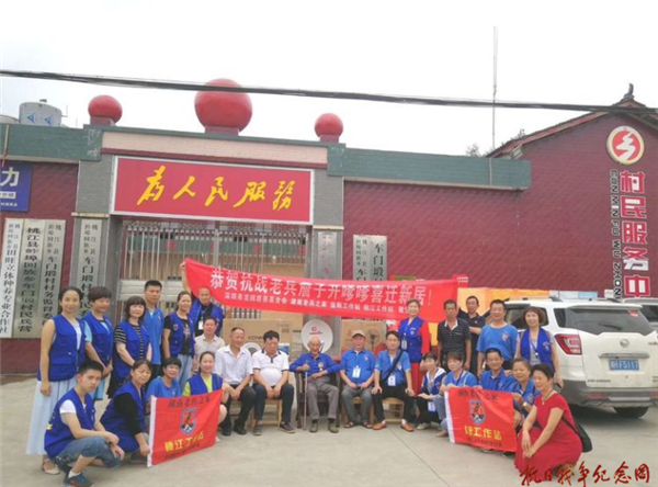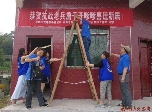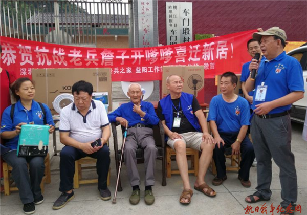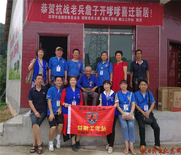 2019年7月7日上午,在七七事变,爆发82周年纪念日之际,由深圳市龙越慈善基金会众筹专款,委托湖南老兵之家、益阳工作站、 桃江工作站组织22位志愿者,前往桃江县鲊埠回族乡车门塅村,为原国民革命军71军88师孤寡抗战老兵詹子开,乔迁新居喜添家具家电送达接收仪式,在村委前坪举行!众筹专款添置物质有:108升电冰箱一台、电热水器一台、40寸电视机一台、电视接收锅一个、接收器一台、立式电风扇一部、书桌一张、四方桌一张、靠背围椅一把、靠背椅4条共计4760元!湖南老兵之家送精品大米二包!老兵已搬进民政和村委建的新房,每月享有龙越慈善基金会的特困老兵致敬礼金,每月享有政府发的五保户专项补助金,这次搬新房又为他添置了新的家具家电。居住和生活条件有很大的改善和提升,祝福詹子开爷爷今后的日子,将会过得越来越幸福!