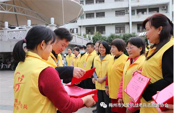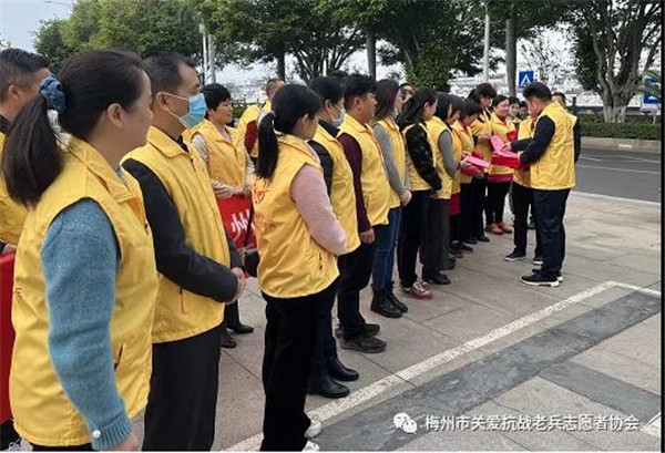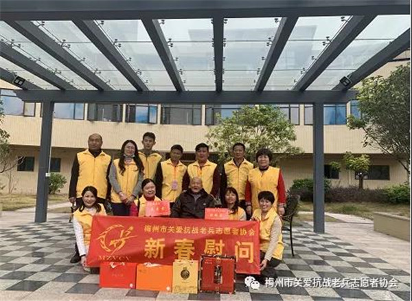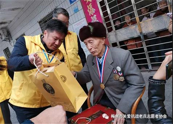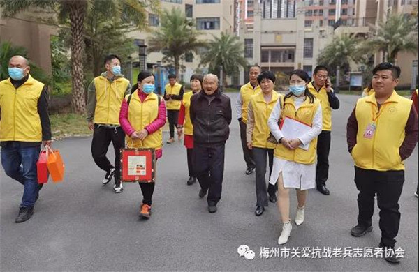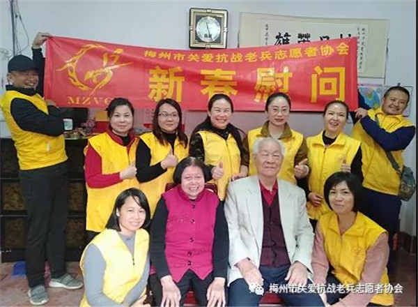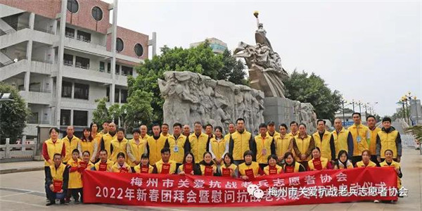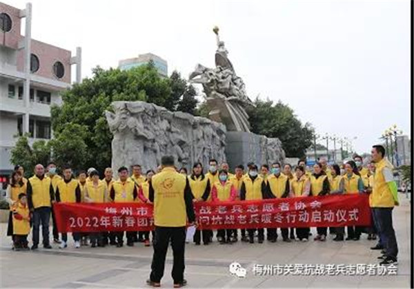2022年1月9日上午,梅城威华雕刻广场,梅州市关爱抗战老兵志愿者协会在这里举行简朴而又隆重的新春慰问抗战老兵启动仪式,正式启动全市今年春节关爱抗战老兵活动。在三九寒冬中,志愿者带着社会各界热心人士暖暖爱心,怀着崇敬的心情,从这里出发,将慰问金、慰问品与爱心亲手送到寒风中坚守的抗战老兵爷爷家里和心里!