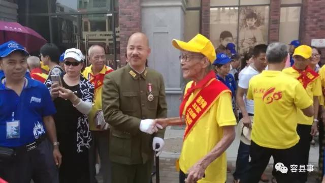 蒋介石扮演者与老兵握手问好,并合照留念!