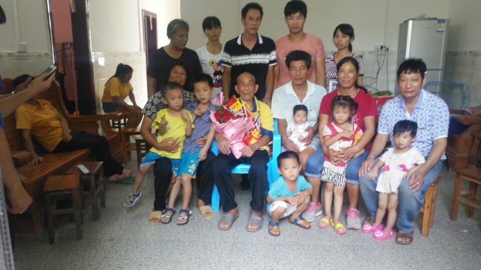 2017年9月21日中午贵港荷城义工协会志愿者集合完毕之后带着愉悦的心情出发去石咀为曹丽金老兵庆贺百岁生日。到了曹爷爷家坐下后,志愿者首先献上鲜花,相册,同老兵握手,祝他生日快乐,开心,添福添寿,接着志愿者跟爷爷一起翻看相册,看照片并聊照片上的事情,爷爷边看照片一边笑得很开心,爷爷说他记得志愿者,他心里记着义工们对他的好,关爱着他们这些老人。现场志愿者们听爷爷聊起以前的经历,爷爷是个号手,还给志愿者吹冲锋的号子,爷爷看起来很开心。