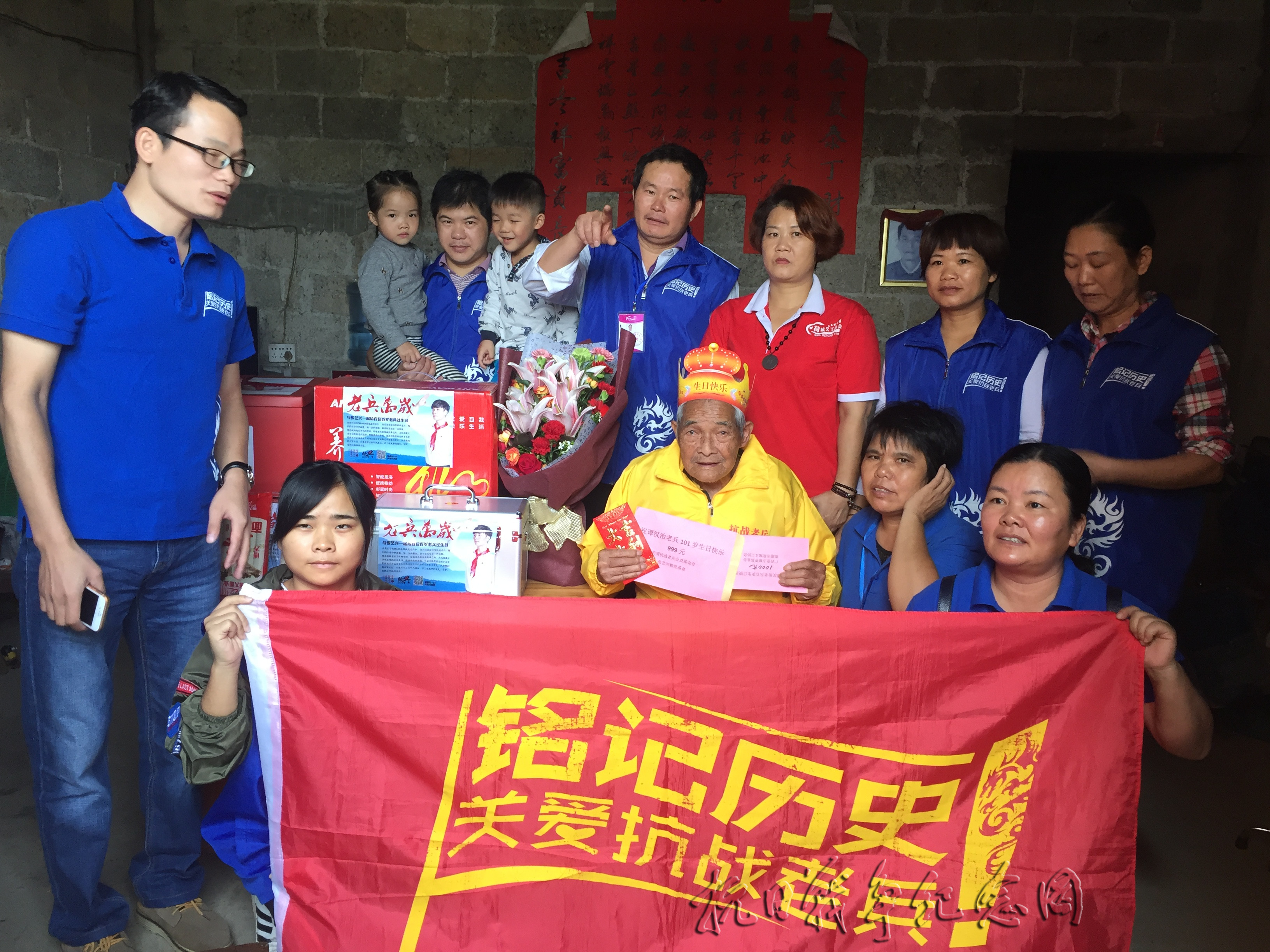 10月28号农历九月初九日是个不平凡的日子!它是贵港抗战老兵谭汉治101岁寿诞。当志愿者的车到老兵家门口的时候,看到谭爷爷早已坐在家门口等着,看到我们的车在门前停下来,连忙柱着拐杖要走来,志愿者们三步并作两步上前扶着爷爷,爷爷高兴地说看到车停我就估计是你们了,爷爷很热情的招呼志愿者进屋里坐,还把在家中忙着做午饭的两个儿子叫出来给志愿者倒茶倒水,很是好客。志愿者向爷爷及家属恭祝生日快乐,并把蛋糕和礼包放好后,拿出大红横福准备挂在墙上,谭爷爷认得一些字,眼睛视力也还不错,看着横幅一个字一个字地念着,志愿者问他:看到吗?认得字吗?他乐呵呵地说:认得认得,我一个老头子生日惊动了那么多人呵!非常感谢!挂好横幅之后,志愿者扶着爷爷进入大厅坐好,并把鲜花送到到爷爷手里,摆放好蛋糕插上腊烛为爷爷祝寿!志愿者们和家属一起唱起祝寿歌,爷爷淘醉在欢乐的歌声中,当我们把祝寿红包送到爷爷手里时,爷爷才回过神来,并一直说:“太感谢!太感谢!”当看到我们把万岁礼包拆开拿出礼包的物品时,爷爷又感慨万分说:“国家富强了!好人好事更多!我都老了什么做不了还有那么多好心人为我挂心!”爷爷还手抚摸着药箱说:“他们点点滴滴都照顾着我们的生活,想得非常周到!太感谢!想到从前抗战时,一般伤口随地找些树叶用嘴咬碎就敷上止血即可,重大伤员才能到卫生队医治,生活条件更不用谈了”。