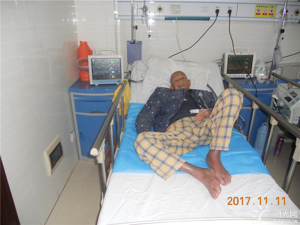老人来到新人民医院,呼吸内科医生也为老人进一步检查身体,陈老患肺部感染、心衰,需要留下观察,为了更好照顾陈老, 我们同医院沟通便联系到了护工,联系了几个护工都说忙,后来联系到一个姓邓的护工阿姨,说当晚没 及时到医院照顾老人,要等第二天即(11月12日)中午12点才有空过医院照顾老人,11日晚上,志愿者琳哥在医院照顾一个晚上陈老,12日早上,志愿者琳哥叫陈老吃粥,老人说:“不想吃,要睡觉”,不料等到13日中午,听说陈老病危,我们平南阳光网的几个志愿者集中赶到了新人民医院,看到医生正在把老人的痰抽出,老人 呼吸很微弱,靠机呼吸,处于昏迷状态。听主任医生说,当天上午10点,陈老已停止呼吸,经医生全力抢救,老人能够挺过来,也听护工邓阿姨说:“陈老早上很凶恶,邓阿姨喂粥给他吃,他一直摆手不吃,喂到嘴边又吃一口,很快吃了一碗粥”,也拉了很多便,志愿者在医院半天,怎么叫他,始终他没有睁开眼,但是我们都和他说话鼓励,叫他一定要挺过难关,告诉他,他是名抗战老兵,功劳大, 会都过难关的,就在这是候,我们通知陈老的侄子出来了,我们叫侄子同陈老多多说说话,通过医生和陈老侄子的协商,继续留院观察,希望陈老奇迹出现。
