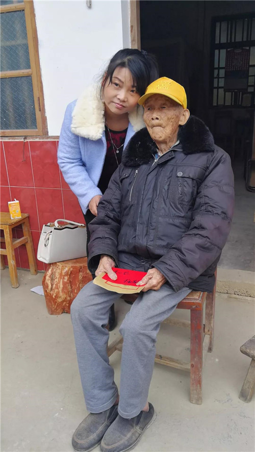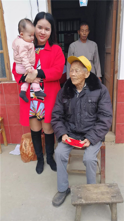 2017年12月13日下午,中力志愿者一行来到山围镇都宫村,沿着弯曲的小路一直上坡,走到路的尽头,来到了106岁秦积才老兵家,这里三面环山,空气很清新,或许这就是秦老长寿的原因之一。