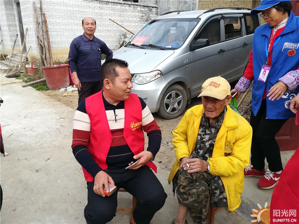 随着志愿者的搀扶之下刘老坐上小车,随同志愿者们一起去前往六陈镇尚梅村给96岁的抗战老兵玉叙生玉老祝寿!