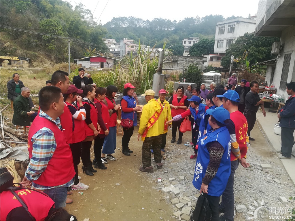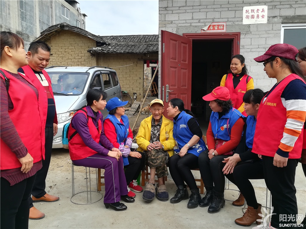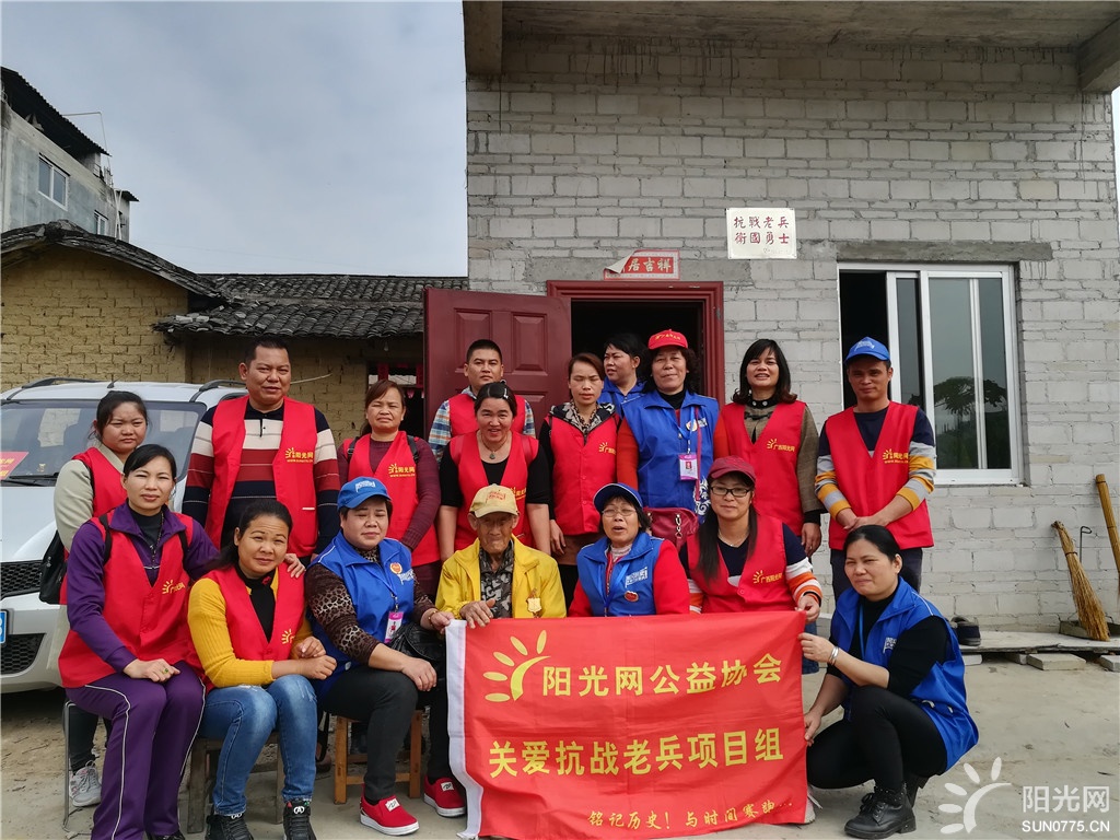 上午广西阳光网美丽、懂你、杨艺敏、人生如梦、姿欣、百合心、小玲、迟来的爱、李教练、乐乐、洪红姐、天空、平常心、黄玲、随心、明天会更好、爱善天使、贵港市荷城义工协会代表果姐,还有木乐满哥一行共十九人拿着慰问品先到抗战老兵刘信辉家慰问。刘信辉老兵见到我们大家到来,高兴地走到门外和我们握手。