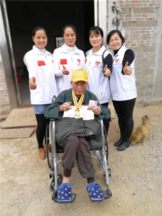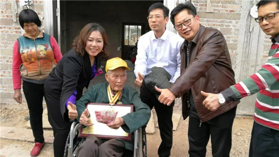 广西体彩中心程汉荣主任和桂彩体育公司的工作人员与志愿者等一行人,前往玉林市玉东新区茂林镇鹿峰村的99岁抗战老兵曾德友家中探望,给他送上一份爱心大礼包—棉裤、棉鞋和500元慰问金。