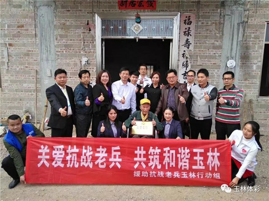 2018年1月16日是玉林市桂彩体育发展有限公司开业庆典的好日子,关爱抗战老兵玉林、北流、容县、陆川团队于早上9:00到场祝贺并现场接收了该公司捐献给抗战老兵的冬衣、棉鞋等关爱礼物。下午2点30分,志愿者携手玉林市桂彩体育公司和广西体育彩票管理中心开展了“情暖寒冬 致敬英雄”慰问抗日老兵活动,看望了玉林市玉东新区茂林镇鹿峰村的99岁抗战老兵曾德友及另外两位老兵,给抗战老兵送去了棉鞋、棉裤、慰问金等。