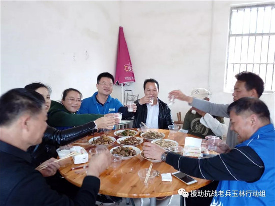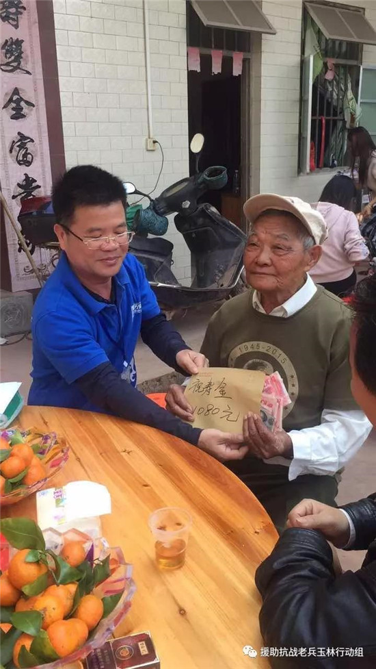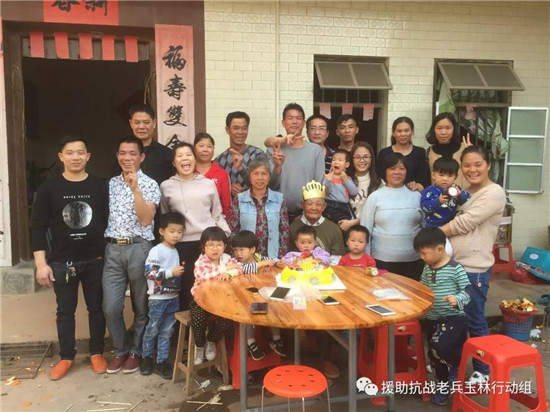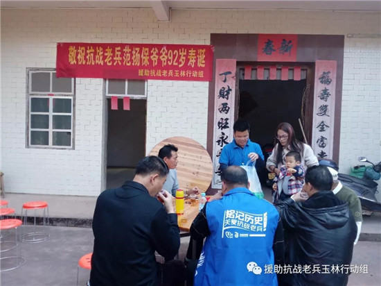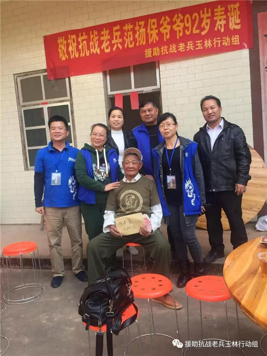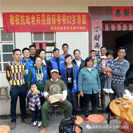 2018年1月18日,范老迎来了92寿辰,援助抗战老兵玉林行动组为表达对抗战老兵的敬意,应范老及其家属的热情相邀,特组织志愿者和各界爱心人士前往祝寿。18日中午,在领队志愿者竹山塘带领下,牛膝、莫姐、蓉蓉、奋斗和豆豆等志愿者和爱心人士前往范老家,奉上各界的贺寿礼金和礼品,献上大家的祝福。
