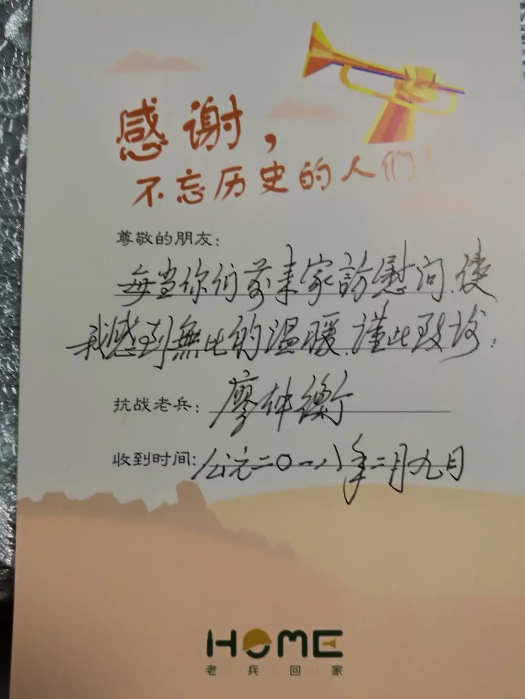2017年我随同老兵关怀活动的志愿者,也是我的老友“摩驴”及“小鱼儿”两次去探望廖老,9月份请他参加抗日战争纪念活动,廖老陈词激昂地在台上说:“老兵永远不死,只会慢慢的凋零,”那是我见过最慷慨激昂的演讲。只是我没有想到身体健康、思路清晰的廖老会“凋零”的这么快。