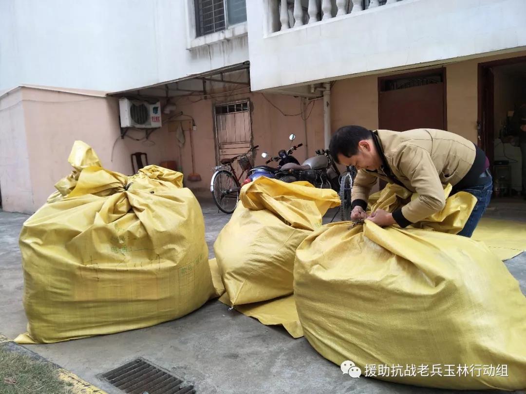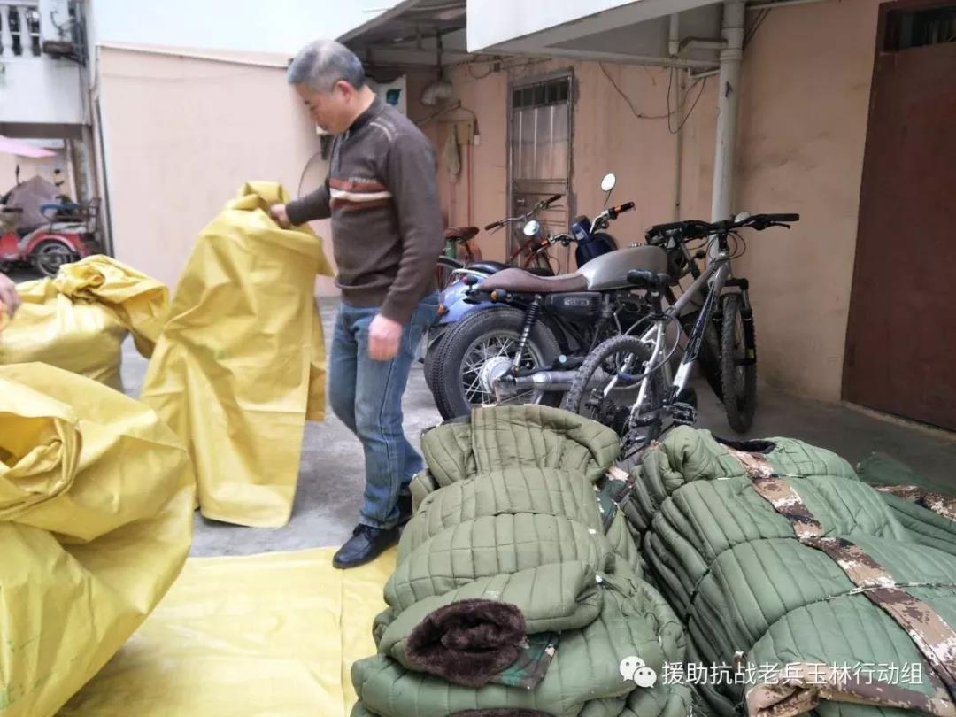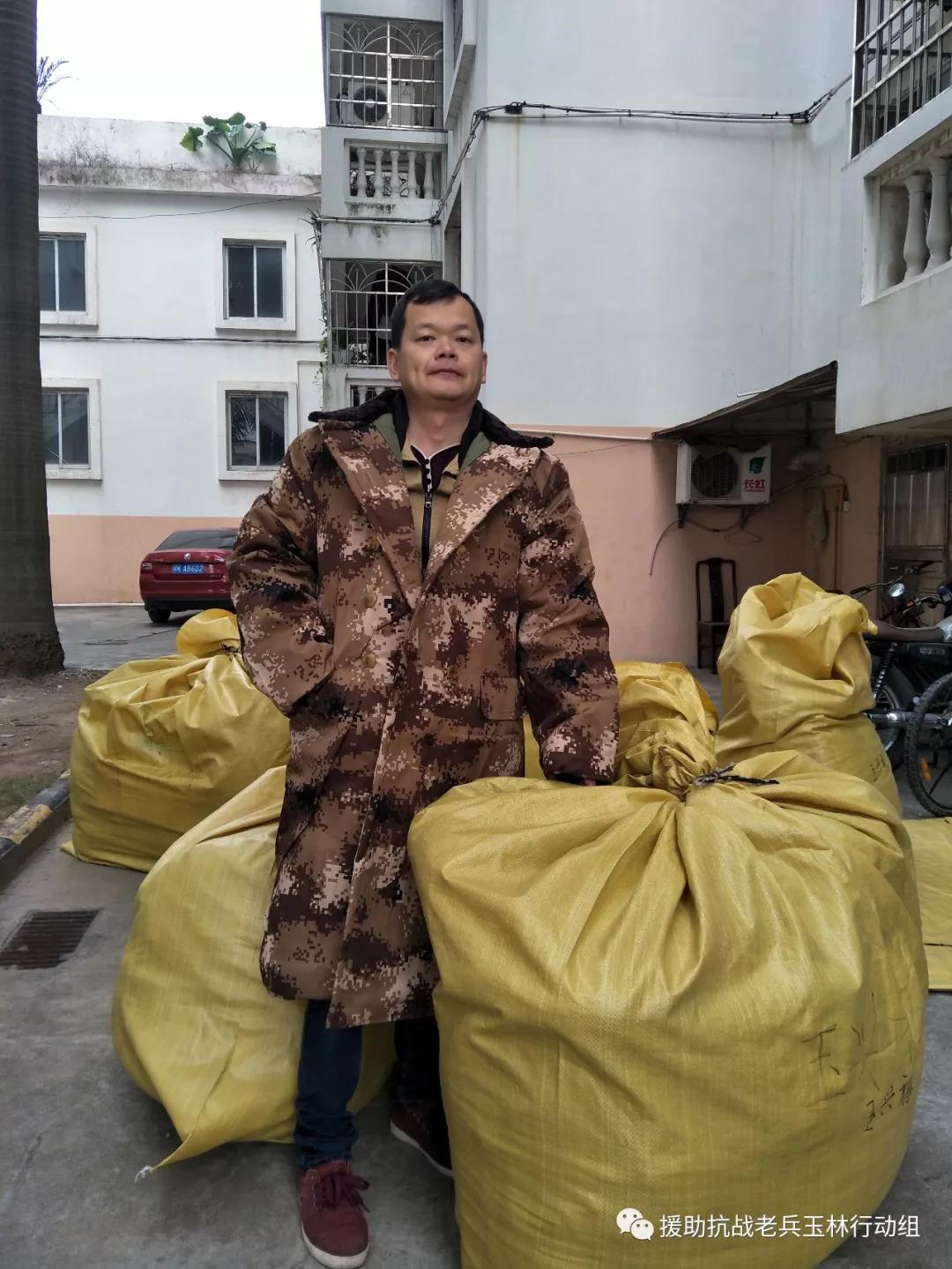 2018年2月4日,援助抗战老兵玉林行动组收到来自玉林市天雀文化传播有限公司黄玉胜先生的冬装迷彩大衣75件,援助抗战老兵玉林行动组名册上健在的容县24位、北流10位、陆川8位、博白11位、玉州福绵及兴业县22位共75位抗战老兵每人一件。