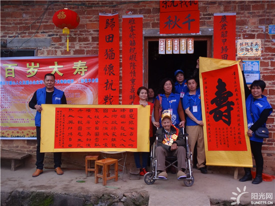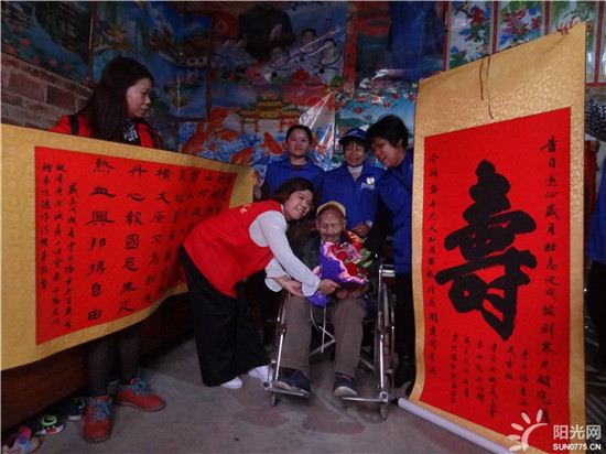 志愿者为老兵送献上一束鲜花和寿字画