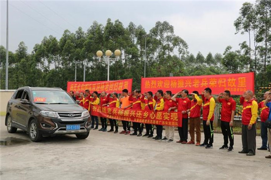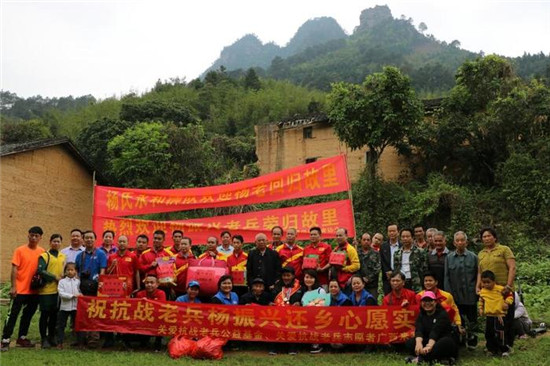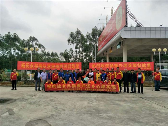 2018年3月初,广西来宾关爱抗战老兵志愿者得知老人又萌生了回家看看的心愿,立刻开始实施帮助实现老人回家心愿行动。经联系,此项目得到中华社会救助基金会关爱抗战老兵公益基金的支持,并由来宾桂平同乡会、桂平杨氏永和狮团、浔州志愿者协会的寻访,准确找到老人原来家乡位置、亲人,从活动筹划、联络、实施用不到一周时间即开始带老人返乡。2018年3月17日,由关爱抗战老兵来宾团队志愿者、杨老外甥陪同,老人终于踏上返乡之路。