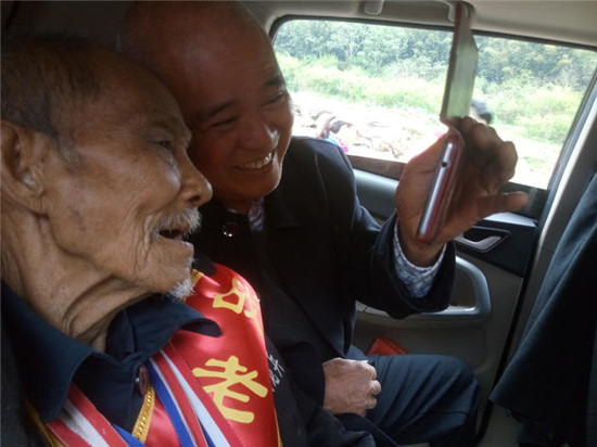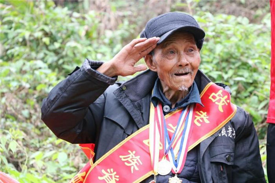 老人开心不已的表情人人喜爱。他用一个军礼来表达感谢之情,众人晚辈受不起如此大礼。