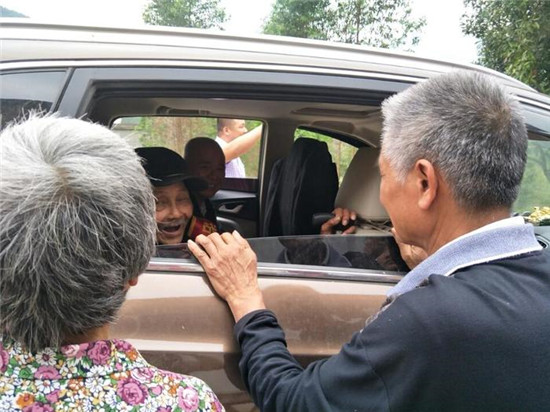 安排杨老远房侄子杨昆光陪同老人,随队医生李慧芳在副驾保驾护航,确保老人安全。侄子杨昆光一路搂着老人不放手,浓浓的情亲随岁月日增。